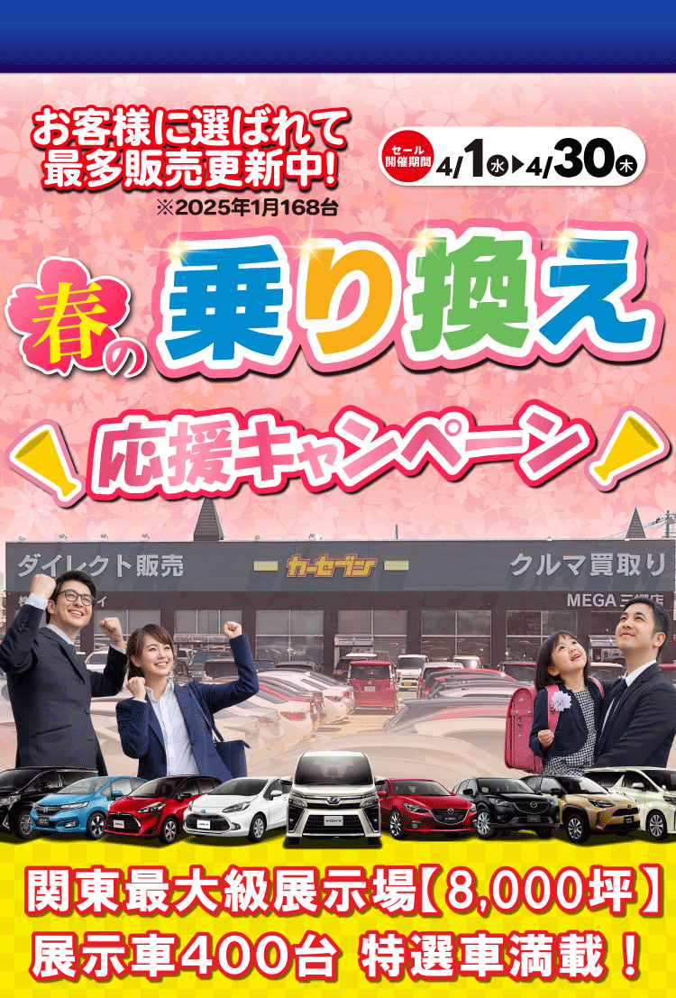 当店は約8000坪の広大な敷地に、軽自動車・コンパクト・ミニバン・ハイブリッド・セダン・インポート車等を常時400台以上展示しています。専門スタッフが全国各地より厳選した仕入れをしています。きっとお気に入りの一台が見つかります。民間車検場も完備しています。納車前に入念な点検整備を行い、さらに納車後も充実したサービスをご提供し、買取も納得の高額査定!きっとご満足頂けます!皆様のカーライフをサポートさせて頂きます。